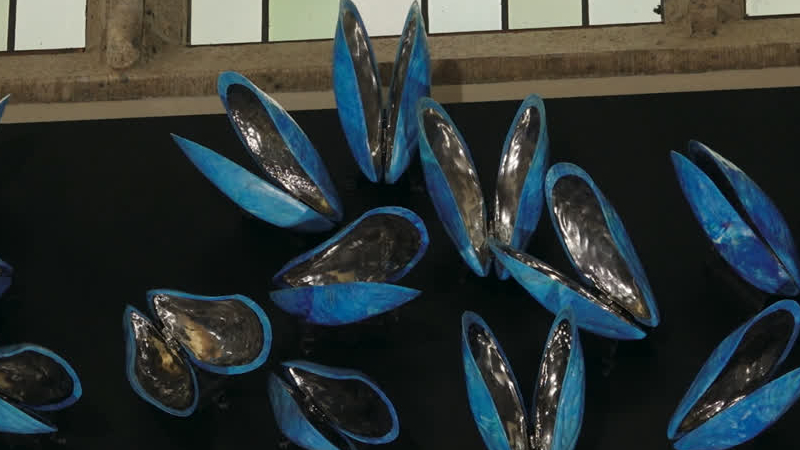 Je kunt er niet omheen als je de Grote Kerk in Dordrecht binnenstapt: zo’n dertig felblauwe mosselen...