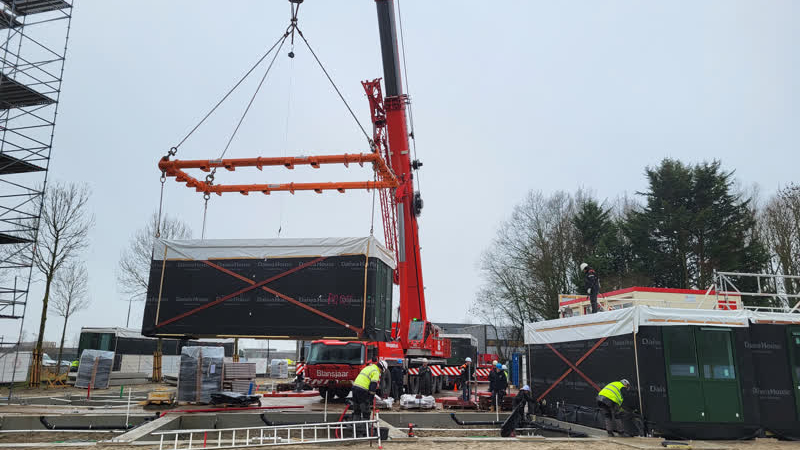 Aan de Laan van Riga in Dordrecht zijn deze week de eerste van 56 flexwoning neergezet. De komende d...
