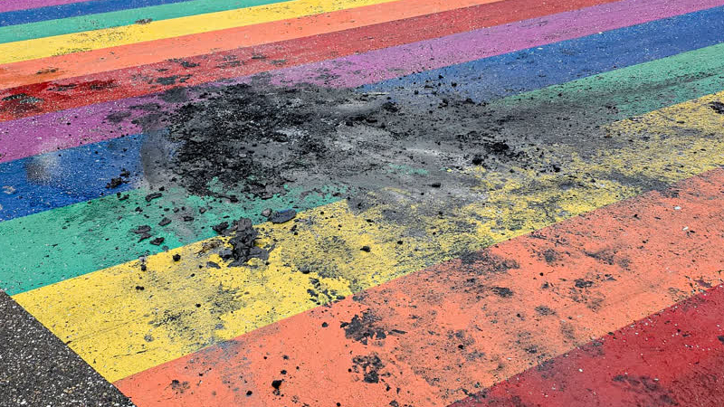 Het regenboog-zebrapad op het Leerpark in Dordrecht is zaterdag opnieuw het doelwit geweest van vand...