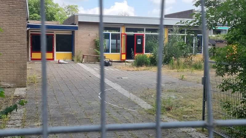 De voorbereidingen voor de sloop van een oude basisschool aan de Pieter de Hoochplaats in Alblasserd...