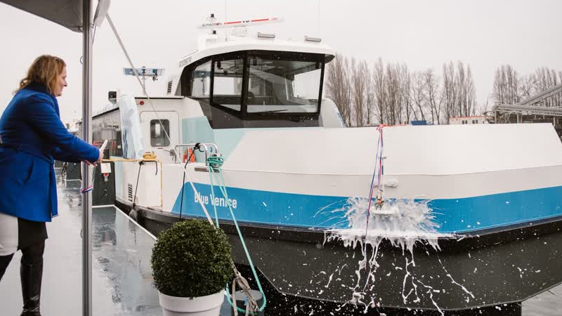 De eerste volledig elektrisch aangedreven waterbus is vrijdag gedoopt. De 'Blue Venice' vaart vanaf ...