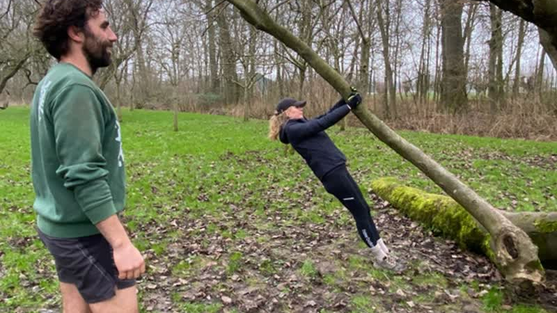 Mannen en vrouwen die in bomen klauteren, die met elkaar worstelen in de modder en die een boomstam ...