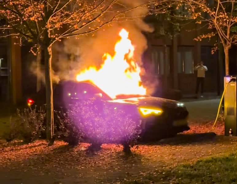 Elektrische auto in vlammen op, sterke vermoedens van brandstichting