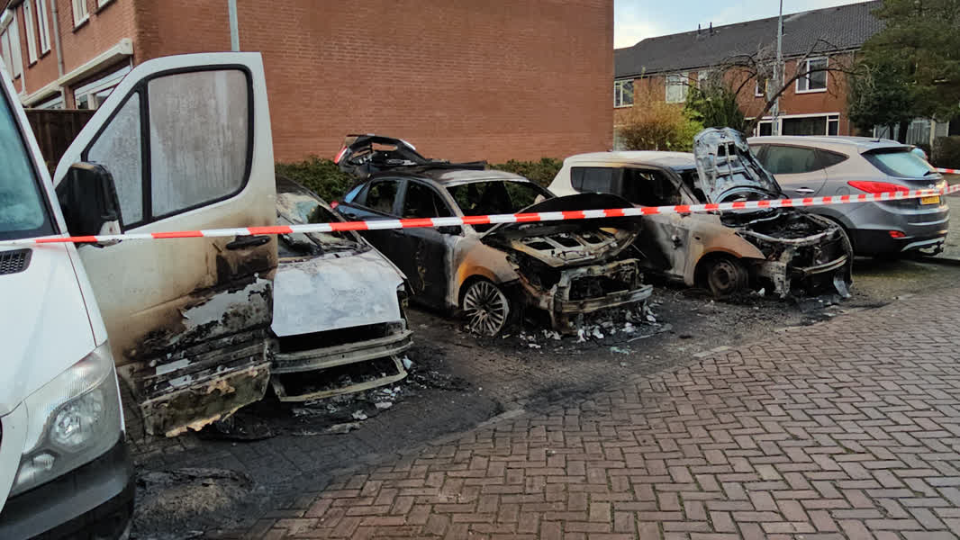Van de drie auto's waar enorme brand ontstond, is weinig over. In de bestelbus woedde brand door de hitte van vlammen die uit de drie auto's sloegen. De zijkant van de bestelbus heeft ook flinke schade. De brandweer meldt dat in totaal vijf voertuigen beschadigd zijn geraakt, maar volgens mensen ter plaatse is er qua beschadiging aan het vijfde voertuig niets te zien.