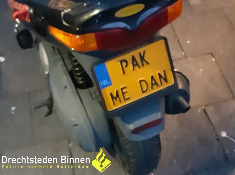 Wijkagenten hebben op bedrijventerrein Dordtse Kil II een opvallende kentekenplaat in beslag genomen. De tekst "Pak me dan" op de kentekenplaat werd na een korte achtervolging ook daadwerkelijk uitgevoerd.