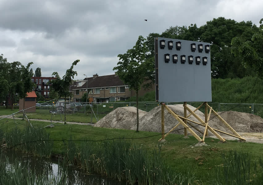 De extra vleermuizenkasten zijn gemonteerd op grote houten panelen die op op poten staan. Het ziet er uit als een reclamebord, maar dat is het niet. De kasten zijn bedoeld voor de vleermuizenkolonie in een oud schoolgebouw. Dat gebouw moet worden gesloopt, maar dat mag niet zolang er geen alternatieve opvang is geregeld voor de beschermde vleermuizen.