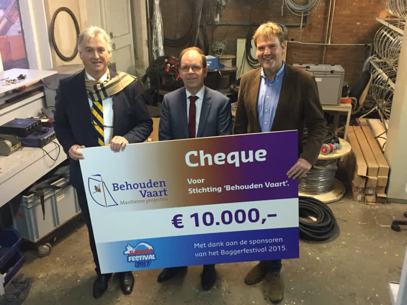 Stichting Behouden Vaart in Dordrecht kreeg vanmorgen een cheque van 10.000 euro van het Baggerfestival in Sliedrecht.