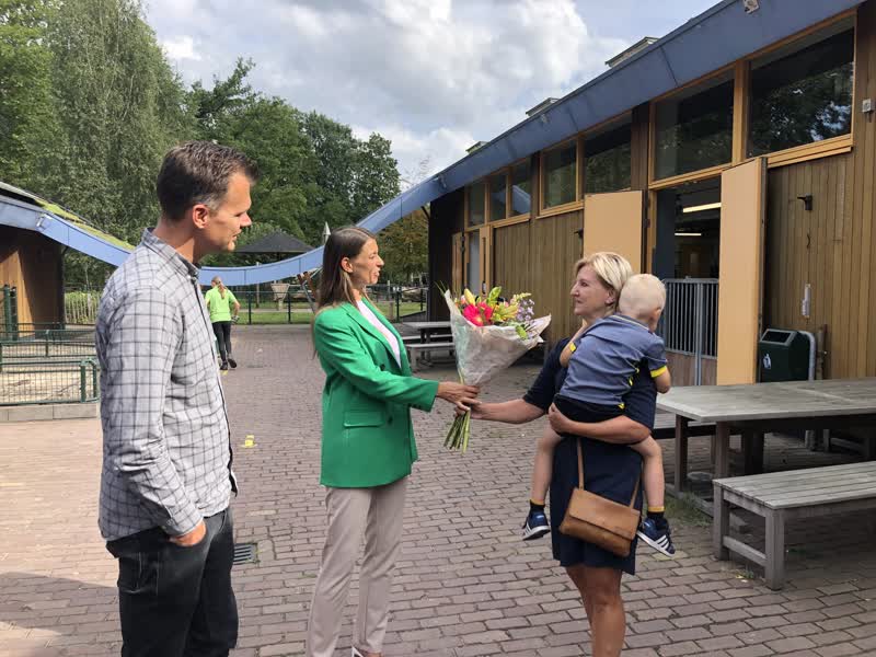 Een nietsvermoedende bezoeker van duurzaamheidscentrum Weizigt is verrast met bloemen door wethouder...
