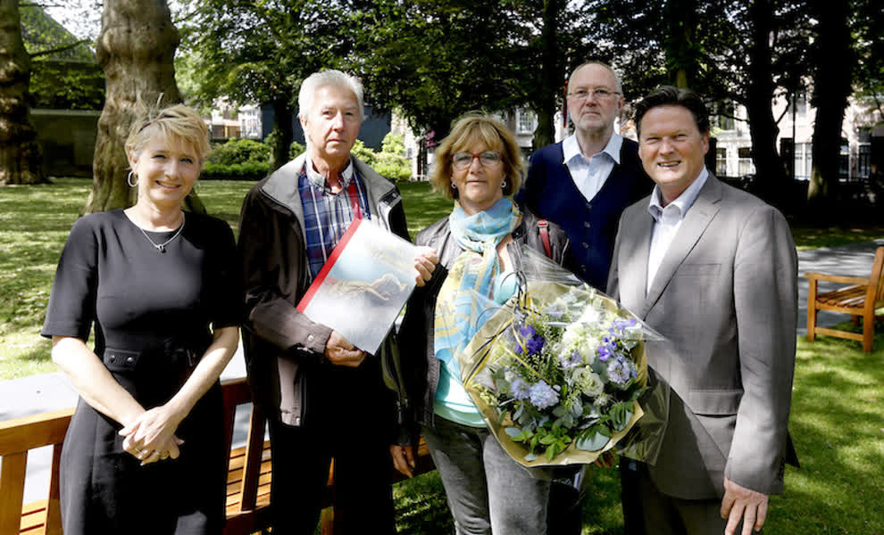 Het echtpaar Van der Velden, speciaal voor de tentoonstelling uit Goes gekomen, kreeg uit zijn handen een bos bloemen en een catalogus. Art & Dining bood een gratis lunch aan.