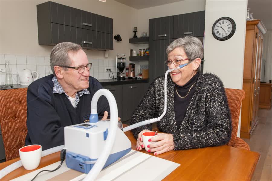 Bij de BiPAP is het namelijk zo dat de lucht onder druk de luchtwegen in ging, voor sommige patiënten was dat vrij heftig. MyAirvo is een mildere variant. Het apparaat haalt lucht uit de omgeving en werkt dus zonder gasflessen. Patiënten die al zuurstof gebruiken thuis kunnen er op aansluiten.