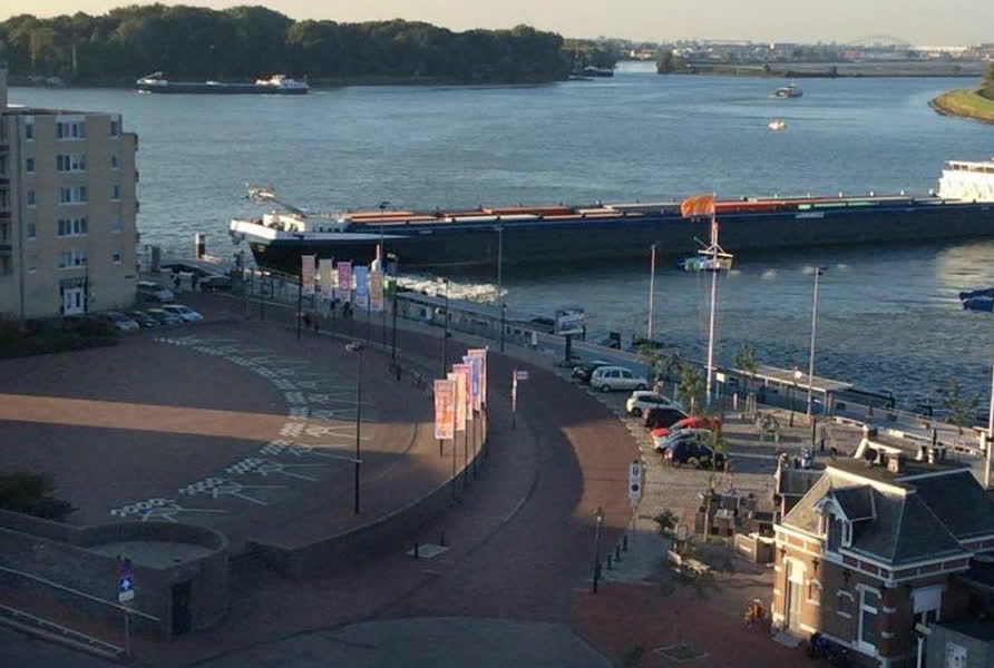 Het binnenschip Comienzo is rond 18.15 tegen de steiger van de Waterbus aan de Merwekade gevaren. De oorzaak is onbekend. De Rivierpolitie doet onderzoek.Foto: Agnes Poot