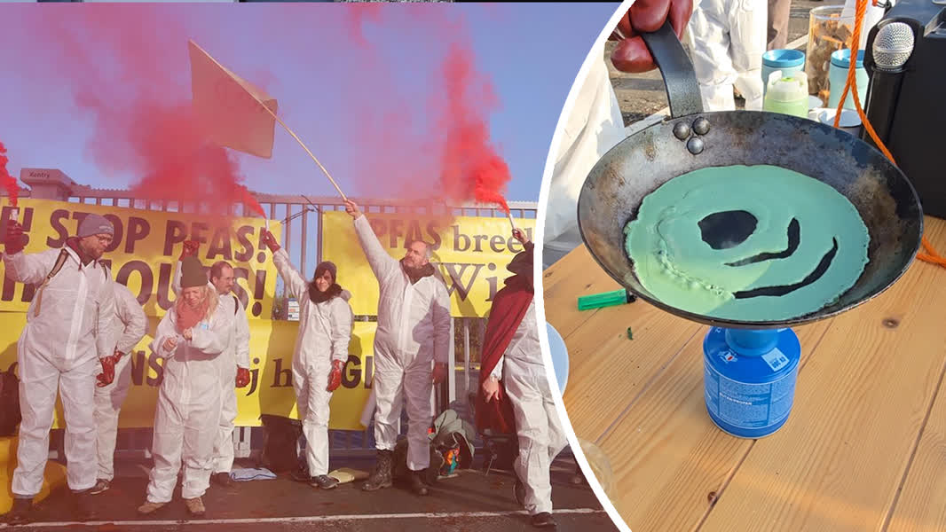 De actie bij de poort van het bedrijf is vooral ludiek ingestoken. “Ik probeer altijd lekkere pannenkoeken te bakken, maar dat lukt helemaal niet meer in Dordrecht”, zegt een actievoerder in een witte overall, wijzend naar een groene pannenkoek op een gaspitje.