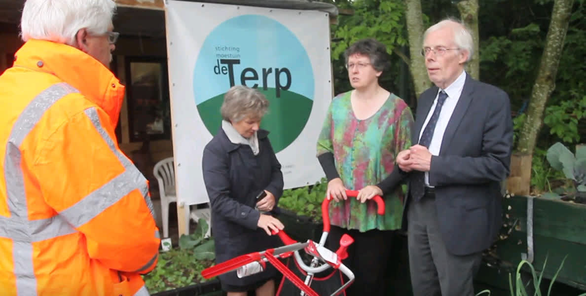 In Moestuin de Terp, aan de Reggestraat, heeft wethouder Reynvaan vanochtend een afvalkar uitgereikt aan Klaas en Anita Goverts, 2 Dordtse Doorpakkers.