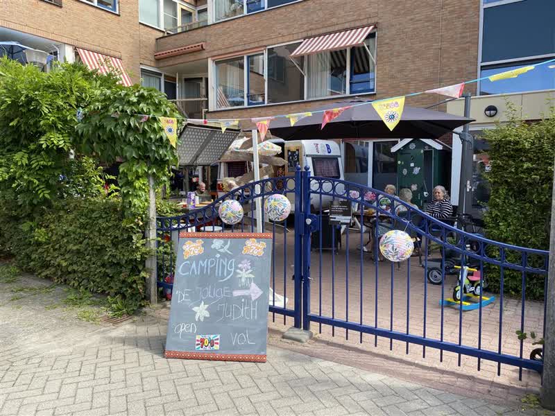 Op woensdagmiddag barst het van de gezelligheid in de voortuin het verpleeghuis. Dit keer is er een pannenkoekenmiddag gehouden voor de bewoners en een accordeonist speelt oude hits. De bewoners genieten zichtbaar. "Normaal gaan we elk jaar op vakantie met de bewoners, maar nu kan dat niet door corona. Toen zijn we op het idee van deze camping gekomen," vertelt Willy Weima van de Judith Leysterhof, zelf ook volledig gekleed in hippiestijl.