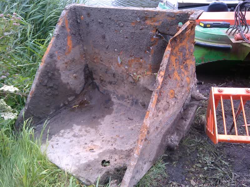 Een ijzeren bak is uit het water gevist door een baggerboot. De bak is nu alleen onvindbaar.