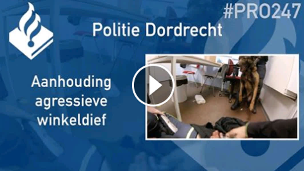 Het filmpje is geplaatst op Youtube en door de politie in Dordrecht gedeeld op Facebook. Te zien is hoe de politie in het kantoortje van de supermarkt een gesprek probeert aan te gaan met de winkeldief. De man maakt een opgefokte indruk. De agenten overwegen pepperspray in te zetten, maar doen dat uiteindelijk niet. In plaats daarvan pakt een politiehond de dief beet en springen de agenten er bovenop.