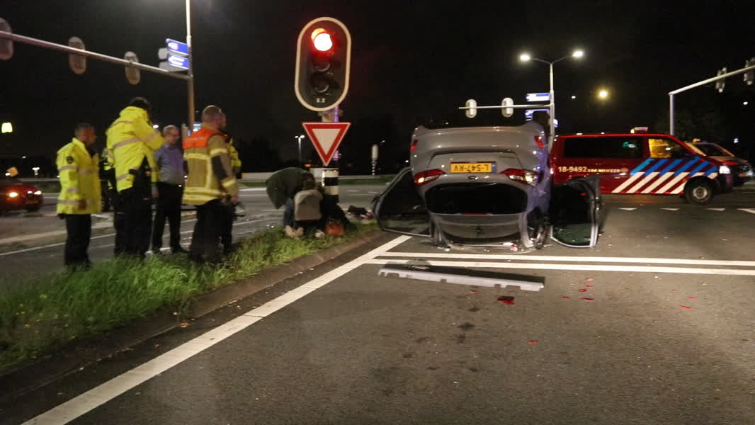 De auto kwam op zijn dak terecht nadat het botste met een ander voertuig.