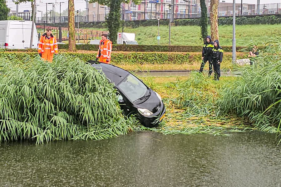 Auto te water in Stadspolders, vrouw loopt nat pak op