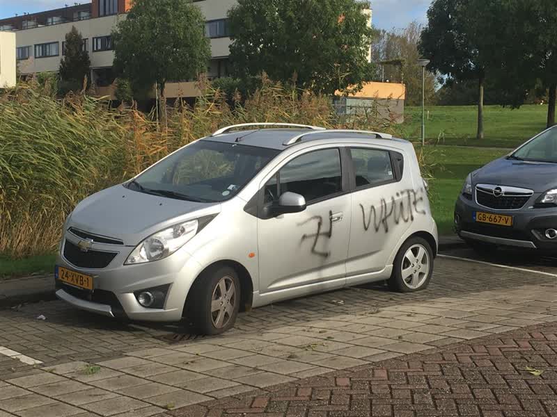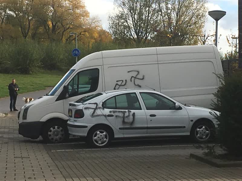 De vernielingen vonden plaats aan de Makoré. Bij zes auto’s zijn gespiegelde hakenkruizen aangebracht. Bij nog eens vijftien auto’s zijn de banden lekgestoken.