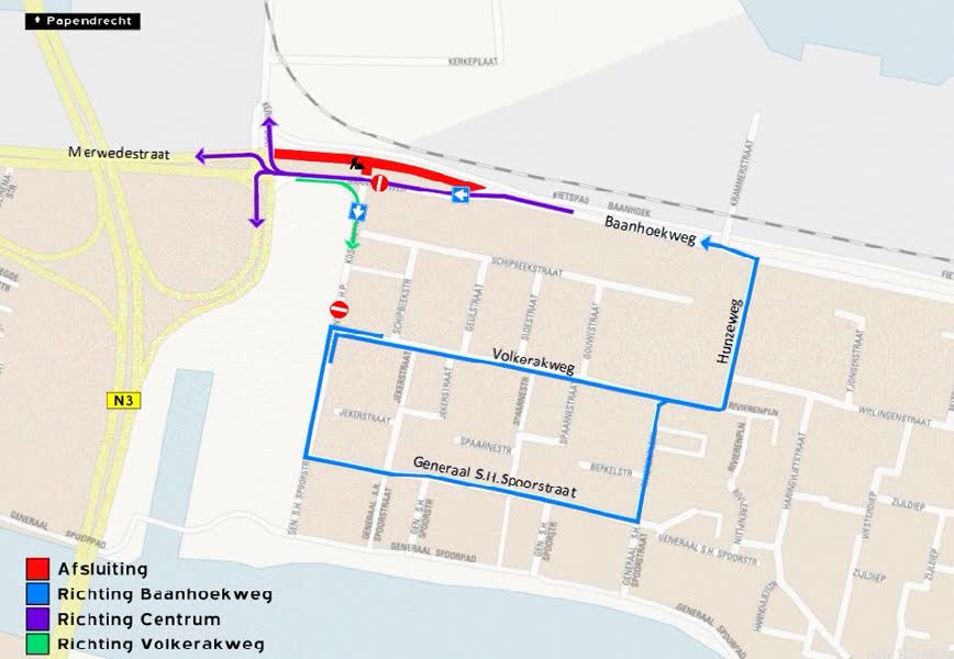 Autoverkeer richting de Merwelanden moet omrijden via de Adjundant H.P. Kosterstraat, Volkerakweg en Hunzeweg. Verkeer richting N3 en het centrum wordt over de zuidelijke rijbaan van de Baanhoekweg geleid. Fietsers vanuit de Adjundant H.P. Kosterstraat kunnen via het fietspad Oostzijde rondweg omfietsen. Om er voor te zorgen dat de wijk geen overlast krijgt, leiden verkeersregelaars het vrachtverkeer over de Baanhoekweg.