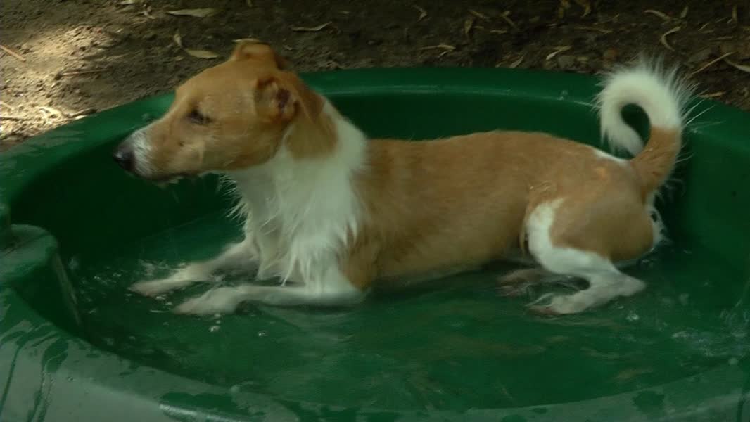 Honden kunnen niet zweten. "Daarom moet de verkoeling komen van drinken en in bad gaan", weet Mylène; "vooral de voetzolen zijn belangrijk, ze hoeven niet kopje onder, al zijn er die dat ook doen."