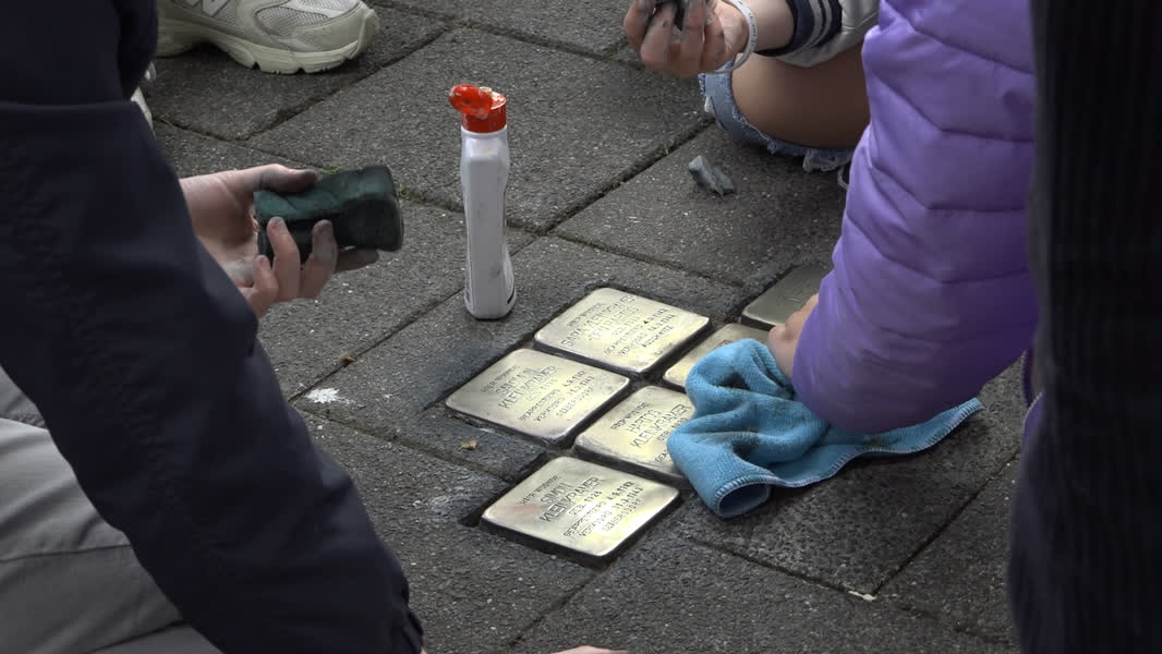 Vervolgens gaan de kinderen van start om te poetsen, terwijl het andere deel van de klas verder is gelopen om ervoor te zorgen dat de tien gedenkstenen op de Adriaan Volkersingel ook glanzend schoon worden. "Het is belangrijk om de Joden op deze manier te herdenken omdat we anders vergeten hoe erg het toen was en hoe slecht ze het toen hadden", vertelt een meisje met een spons in haar hand.