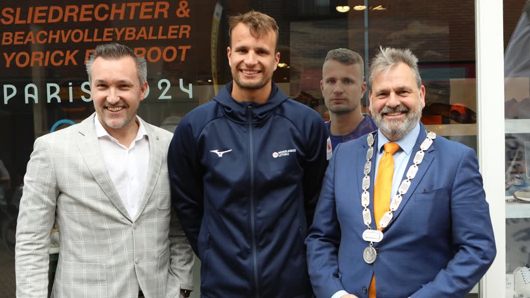 Het uitzwaaimoment vond plaats bij schoenenwinkel van Mourik. De winkel is al zestig jaar betrokken bij de volleybalsport in Sliedrecht als sponsor en lid van de business club. “In de etalages van de winkel liggen ook de olympische outfit die Yorick vier jaar geleden droeg toen hij aan de jeugdspelen meedeed en zilver haalde.”, laat Jeffrey van Mourik weten. De eigenaar van de schoenenzaak is ook op persoonlijk vlak bekend met de familie van de Groot.