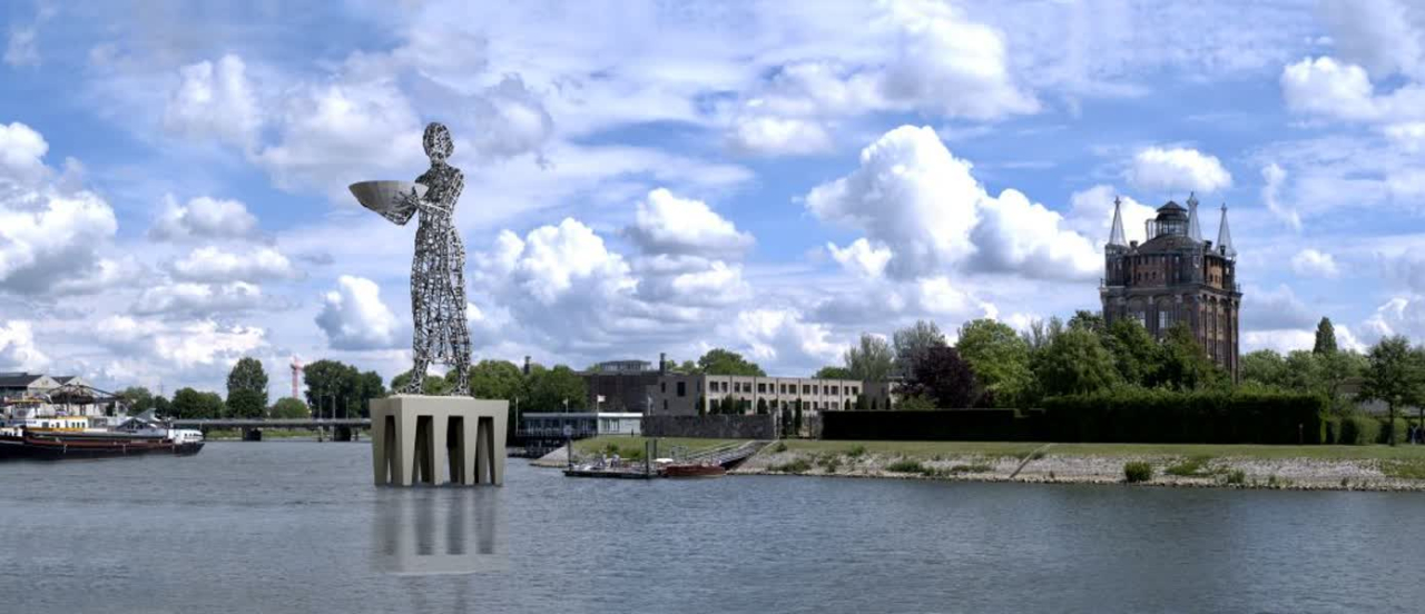 Hanneken stelt een jonge vrouw voor, die zorgvuldig een grote schaal vóór zich in evenwicht houdt en met haar rechtervoet een pas voorwaarts zet in de richting van de rivier, als symbolische illustratie van de verbondenheid van de stad met het water.