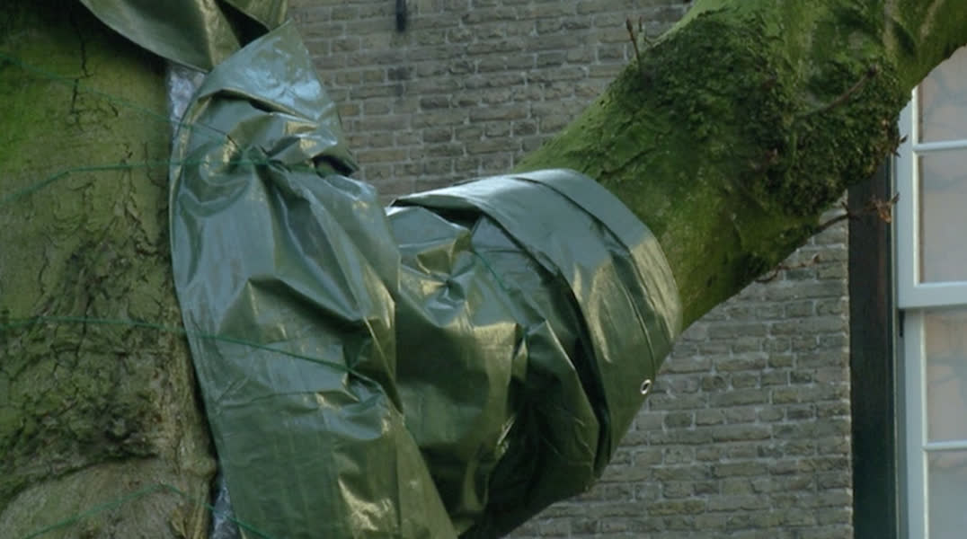 De zieke kastanjeboom op de Statenplaats krijgt als eerste in Dordrecht een warmtebehandeling.