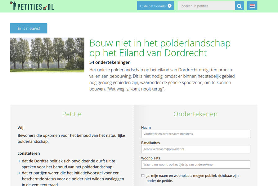 Onder de naam 'Bouw niet in het polderlandschap op het Eiland van Dordrecht’ heeft de partij een petitie online gezet. “Door deze petitie wil Beter Voor Dordt nadrukkelijk het behoud van het fraaie polderlandschap onder de aandacht brengen en houden. Behouden van het prachtig polderlandschap is Beter Voor Dordt!”, laat de partij weten.