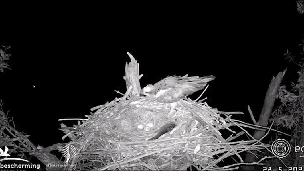Eind april lagen er die eieren in het nestje. Het eerste kuiken is vandaag uit het ei gekropen. Op de jongste twee telgen moeten we waarschijnlijk nog even wachten. Het eerste ei van de visarenden werd namelijk vijf dagen eerder gelegd dan de andere twee.