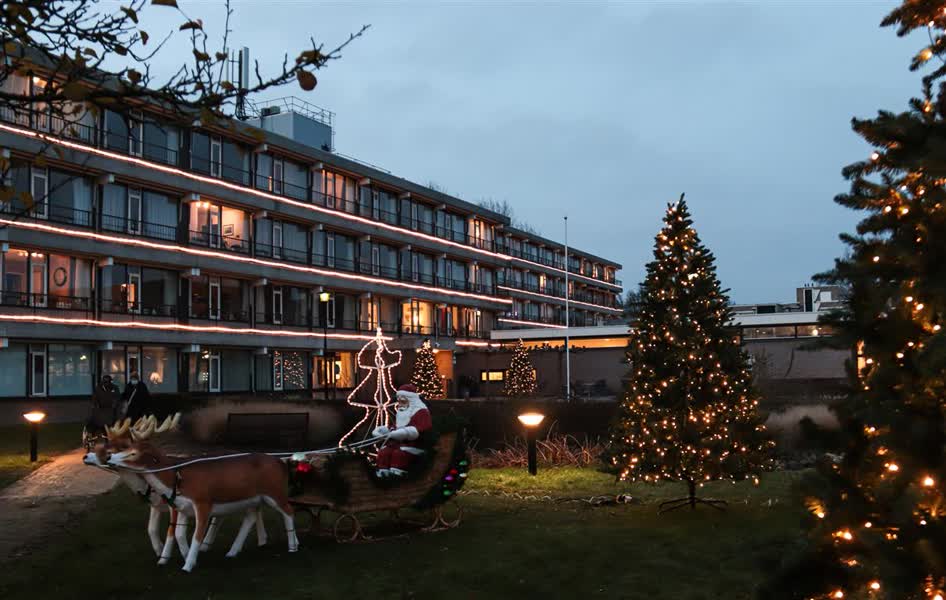 De 830 bewoners van het woonzorgcentrum kunnen dus wandelend of vanuit hun kamers genieten van de kerstsfeer. Balkons en bomen zijn sfeervol versierd en in de voortuin staat een verlichte kerstman, inclusief zijn arrenslee.