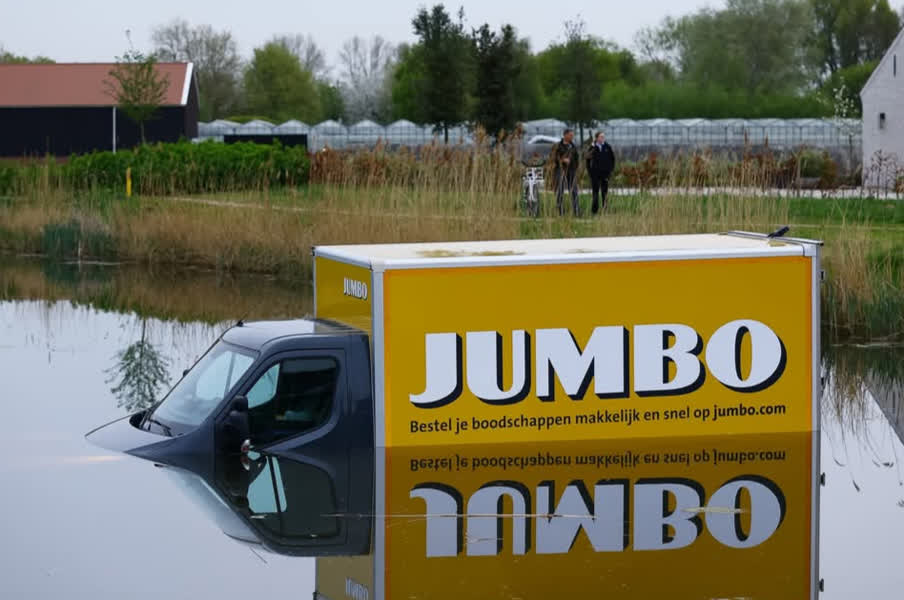 Een bestelbusje van supermarkt Jumbo is woensdagavond te water geraakt in Ridderkerk. Bewoners van het Gieser Wildeman-erf in Rijsoord keken vreemd op toen de wagen rechtdoor het water in reed.