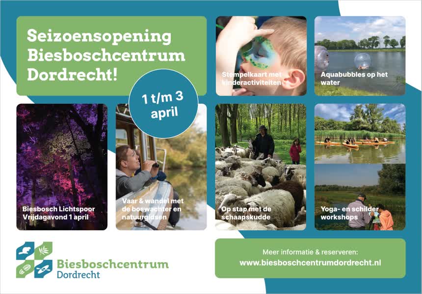 De seizoensopening van het Biesboschcentrum komt er weer aan. Van 1 tot en met 3 april zijn er weer tal van activiteiten om het seizoen te openen. In het weekeinde kun je volop varen en wandelen met de boswachter en natuurgidsen. Ook kan er worden gevaren in een kano door de Hollandse jungle en zijn er diverse workshops.
