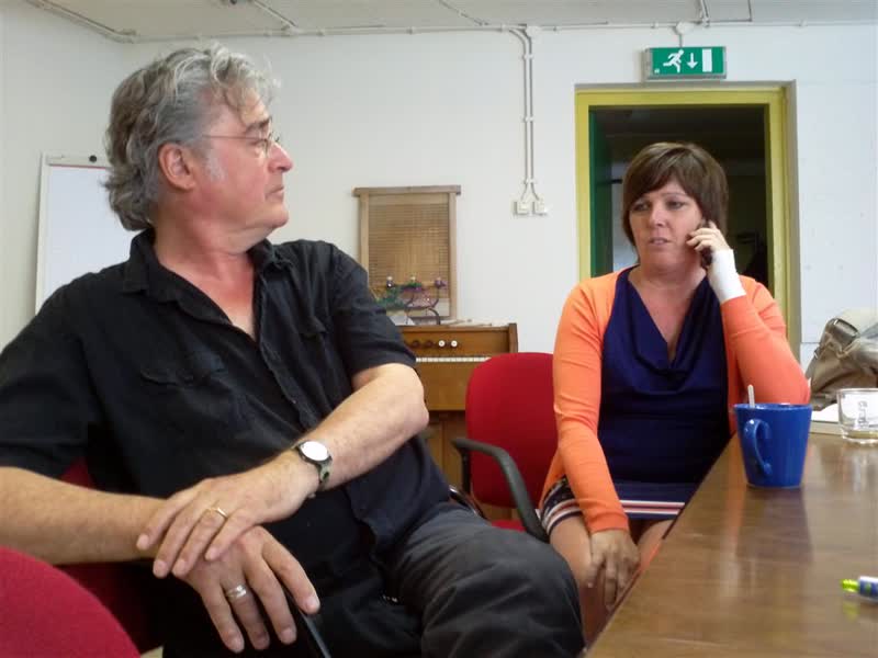 Foto: Liselotte Gatzen (r) van Big Rivers belt Leon Lissitza, Kees Koene van ToBe luistert mee.