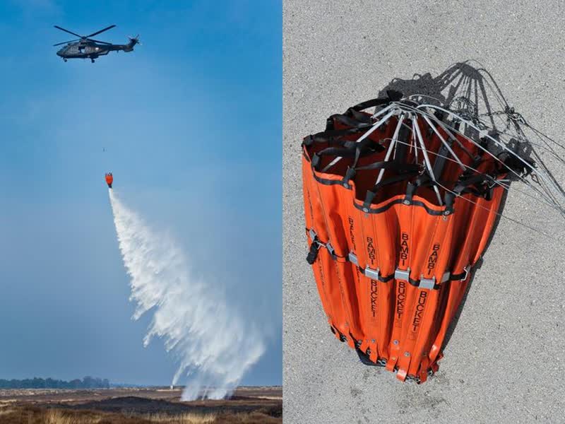 Onder de blushelikopter hangt een zogenoemde fire bucket, een zak voor water. Daarmee wordt water uit de rivier opgeschept en vervolgens boven de brandhaard gelost. Tijdens deze oefening zal de helikopter twee of drie keer dit ritueel herhalen.