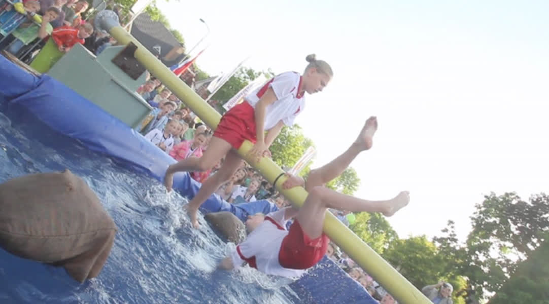 Het jaarlijkse boegsprietgevecht in Dubbeldam is dit jaar gewonnen door de Beatrixschool.