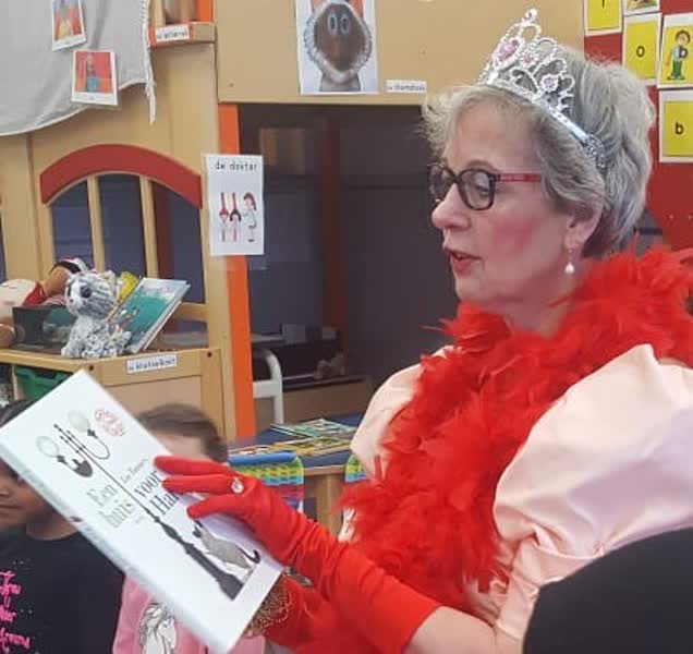 Het bezoek had wel wat voeten in de aarde, zo kon de prinses alleen maar voorlezen als ze op een stapel boeken zit, vol enthousiasme luisterden de kinderen naar het verhaal.