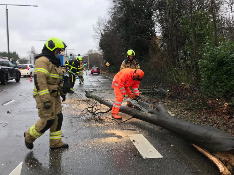 De boom lag in eerste instantie in zijn geheel op de weg maar de gemeente sleepte hem naar een stukje verderop. Mensen van de brandweer hebben de boom in stukken gezaagd.