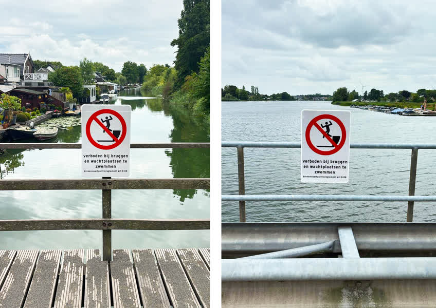 Het is zomer en dat betekent voor velen een zoektocht naar verkoeling. Die vinden mensen uit Ridderkerk, Zwijndrecht en Hendrik-Ido-Ambacht bijvoorbeeld in de Waal. Omdat veel jongeren echter vaak van de bruggen over het riviertje springen zijn er nu borden geplaatst die het 'brugspringen' tegen moeten gaan.
