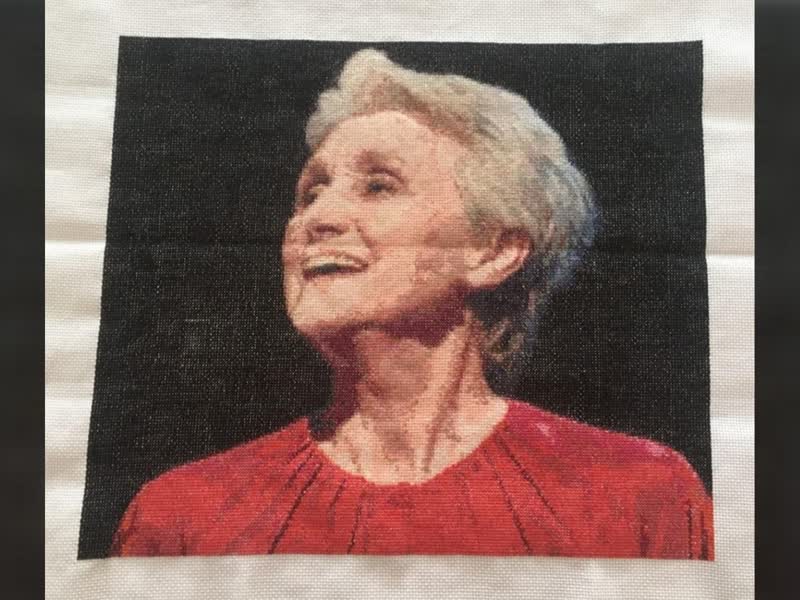 Op het borduurwerk is een portret van een oudere vrouw te zien, met een roodoranje blouse, tegen een zwarte achtergrond. "Het is een actrice, een oud-docent waar Boukje les van heeft gehad. Jaren geleden zijn we samen naar een toneelstuk geweest waar ze in meespeelde. Toen had ze bedacht: dit ga ik maken voor haar, omdat haar oud-docent zelf ook borduurt."