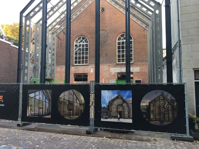 “Het is een controversieel kunstwerk met glas in loodramen met veel ruimte daaromheem,” zegt de architect. “Het gebouw wordt zo een luchtig geheel.” Dat is ook goed aan de andere kant van het pand te zien. “Het pand van huisnummer 63 verdwijnt en hier komt een verbinding naar de Kloostertuin. Samen met de glazen hal vormt deze steeg de entree van de kerk.” De hoop is het project nog dit jaar af te ronden.