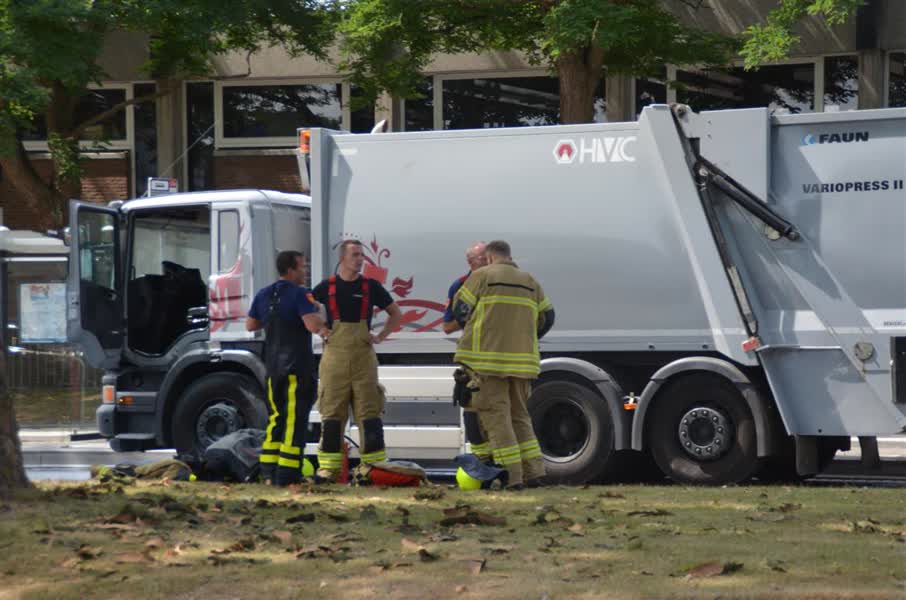 Een vrachtwagen van HVC heeft vanmiddag op de Hugo van Gijnweg vlam gevat na een oververhitte motor. Een leiding met hydraulische vloeistof was kapot gegaan. Door de kapotte leiding ligt er een oliespoor over de Hugo van Gijnweg.