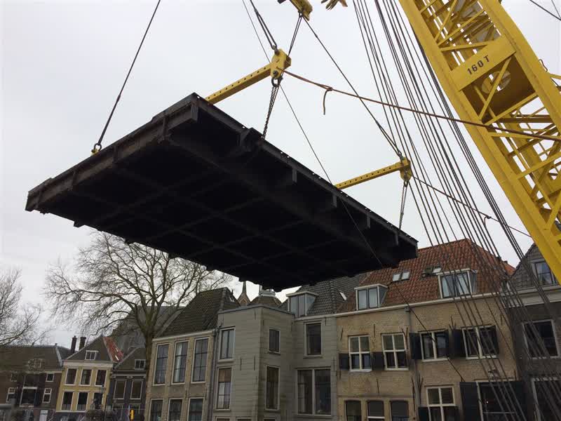 Een deel van de Engelenburgerbrug is vrijdagmorgen weggehesen. Het twintig ton zware brugdeel wordt eerst naar Rotterdam gebracht en zal later in Middelburg gerenoveerd worden.