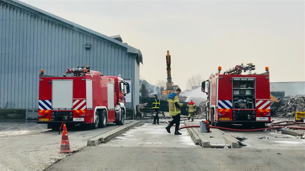 De spuitgasten zijn de hele dag bezig met nablussen. Alle samengeperste papierbulken worden met bulldozers uit elkaar getrokken. Dat wordt dan nat gemaakt. Daardoor moet de broei doven.