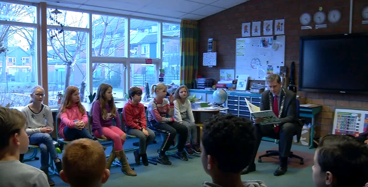 Burgemeester Wouter Kolff leest voor aan groep 7 van Het Kristal