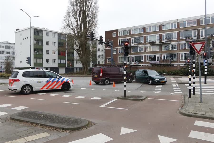 Een personenauto is dinsdagmiddag op de kruising van de Hugo van Gijnweg met de Spirea en Galileïlaan geschept door een busje. Twee mensen zijn gewond naar het ziekenhuis gebracht.