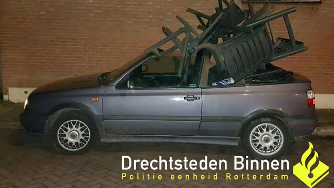De politie heeft gisteren een man aangehouden die in een open cabrio vol gestolen tuinmeubels reed.