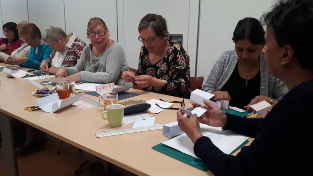 Voor de mantelzorgers was vanochtend de creatieve workshop cadeaudoosjes vouwen in cultureel centrum Sterrenburg. In het doosje komt uiteindelijk een klein cadeautje, wat mee naar huis genomen kan worden.