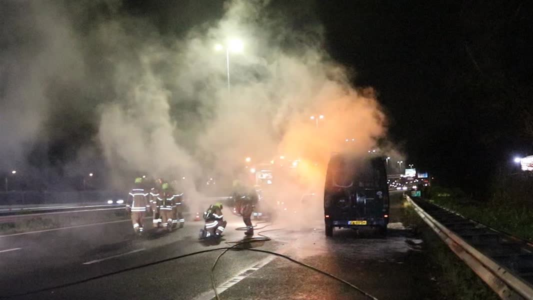De Rijksweg was een half uur afgesloten, daarna werd er één rijstrook geopend. In de camper zaten twee personen. Die konden op tijd de camper verlaten en zijn ongedeerd gebleven.